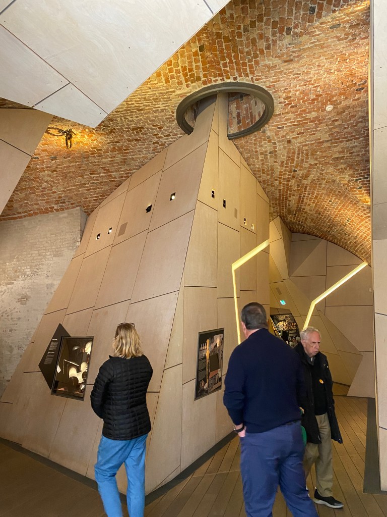 The Hebrew word mitzvah means good deed, large or small. The museum, designed by Daniel Libeskind, is inspired by the 4 Hebrew letters that spell Mitzvah. It repurposes a historic galley building built by King Christian IV, the king who originally invited Jews to settle in Denmark in 1622. Modern and historic elements blend, both uneasily and smoothly, and that’s on purpose. The flooring is intentionally unsteady, and the wooden planks suggest the fishing boats of 1943…a national mitzvah. But not without bumps, both literal and symbolic.